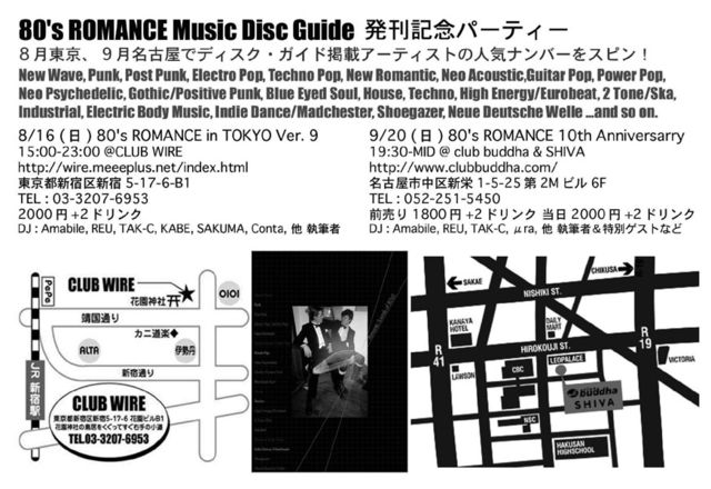 9/20 (日) 80's ROMANCE The 10th Anniversary Special Issue & 80's ROMANCE Music Disc Guide 発刊記念Party 19:30-MID @ club buddha & SHIVA http://www.clubbuddha.com/ 名古屋市中区新栄1-5-25第2Mビル6F TEL : 052-251-5450 前売り 1800円+2ドリンク 当日 2000円+2ドリンク DJ : Amabile, REU, TAK-C, μra, SAKUMA ゲストDJ : chris, HAKASE, monstera, NONO, nozap!!, Toshi, ZECK 99年9月13日にスタートした80's ROMANCEも、ついに10周年を迎えます! この日はディスク・ガイドの発刊記念も兼ねたスペシャル・パーティー。