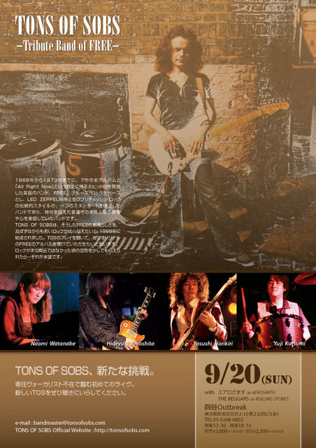 FREEのトリビュートバンド「TONS OF SOBS」次回ライヴのお知らせです。