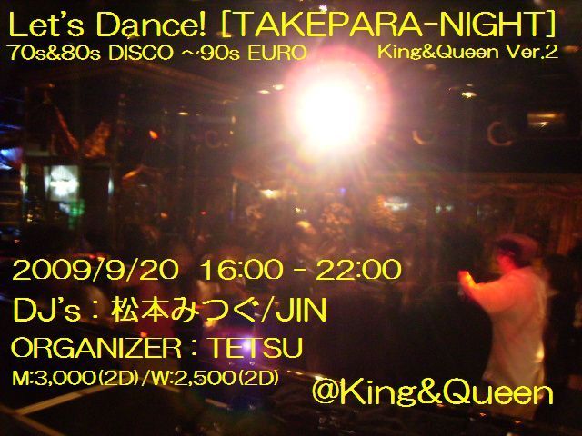 4月に引き続き今月もキングで開催します。・。・゚★・。・。☆・゚・。・゚ 【イベント名】Let’s Dance! 〜TAKE PARA NIGHT〜 King&Queen Ver.2 【日時】9月20日(日) 【時間】16:00-22:00 【料金】男性3000円(2D)/女性2500円(2D) *フロントで「てっちゃんのゲスト」もしくはフライヤー画面掲示で500円OFF 【DJ】 JIN(Let’s Dance!・元東亜会館GREECE・根岸倶楽部他) 松本みつぐ(Let's Dance!・元NEWYORKNEWYORK・チェスターバリー他) 【ORGANIZER】 てっちゃん 【ジャンル】ソウル系〜ミ