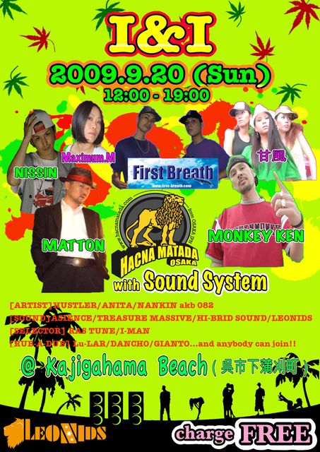2009.9.20 (Sun) 『I&I』 @KAJIGAHAMA BEACH 広島県呉市下蒲刈家事梶ヶ浜BEACH START 12:00-19:00 ADM FREE [SPECIAL GUEST] MONKEY KEN MATTON HACNA MATADA with SOUND SYSTEM FIRST BREATH NISSIN 甘風 Maximum.M [SOUND] ASIENCE TREASURE MASSIVE HI-BRID LEONIDS [SELECTOR] RAS TUNE/I-MAN [ARTIST] ANITA/HUSTLER/NANKINaka082 [RUB A DUB] Lu-LAR/DANCHO/GLANT...and anybody can join!! 雨天中止、また災害等主催者の判断でイベントを中止する事があります。 駐車場には限りが