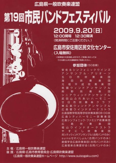 今年も市民バンドフェスティバルに参加します 広島県内の市民バンドが一堂に会するビックイベントです 広島市安佐南区民文化センターHP↓ http://www.cf.city.hiroshima.jp/aminami-cs/
