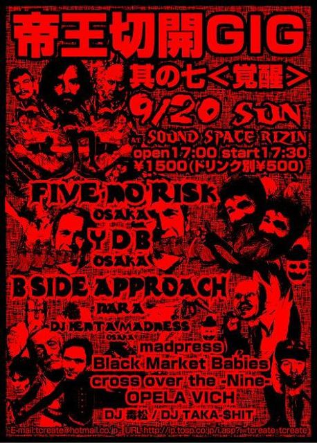 〜帝王切開GIG 其の七〜 @ SOUND SPACE RIZIN' 2009.9.20(日) open17:00 start17:30 料金\1500(ドリンク別\500) <BAND> FIVE NO RISK(大阪) Y.D.B(大阪) B-SIDE APPROACH(奈良) madpress Black Market Babies cross over the -Nine- OPELA VICH <DJ> KENTA MADNESS(大阪) 毒松 TAKA-$HIT ※会場への再入場は禁止となっております。