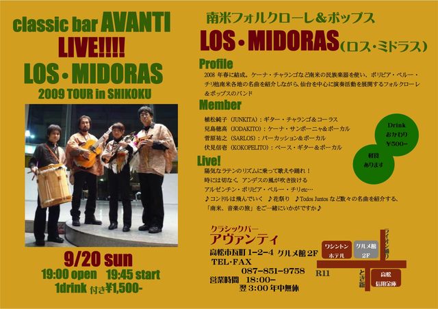 ◆ライブ・タイトル、または出演者 南米フォルクローレ&ポップス LOS・MIDORAS (ロス・ミドラス) なお、演奏のフルバージョンが見れるのはここだけです。 ◆日時 9/20 sun 19:00 open 19:45 start ◆場所 クラッシックバー アヴァンティ 高松市瓦町1-2-4 グルメ館2F TEL・FAX 087-851-9758 営業時間 18:00- 翌3:00年中無休 ◆ライブ・チャージ 1drink付き\1,500- ◆紹介コメント 2009 TOUR in SHIKOKU 2008年春に結成。ケーナ・チャランゴなど南米の民族楽器を使い、ボリビア・ペルー・ チリ他南米