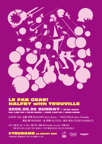 こんにちは。 イベントの告知をさせてください。 どうぞよろしくお願いいたします。 ========================================== FAB GEAR! HALFBY with TROUVILLE 2009.09.20 Sunday (祝前日) START 21:00 to MIDNIGHT @鹿児島 TSUBAME (ex.DOGGY-BAR) // 099.222.5712 前売りチケット// 2,000円 (1 DRINK ORDER) 当日券// 2,500円 (1 DRINK ORDER) ■SPECIAL GUEST DJ 高橋 孝博(HALFBY) Kyoto ■GUEST DJ TROUVILLE from Fukuoka 稲益 修 (WINNIE)/泉 哲雄 (ACTUS)/恵谷 和史 (TICRO MARKET) ■SUPPORT DJ 切通