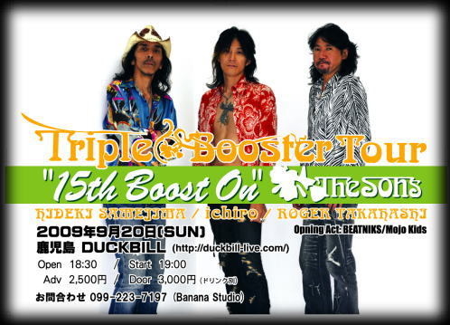 Banana Studio Presents 「The Sons」 Tripe Booster Tour "15th Boost On" Opening Act: BEATNIKS・MojoKids 2009.09.20(SUN) @ DUCKBILL(099-806-7000) Open: 18:30 Start: 19:00 Adv : \2500 Door : \3000(1DRINK Order)