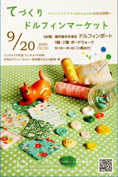 てづくりドルフィンマーケット コンセプトは海辺のおしゃれなマーケット 〜ハンドメイド*cafe*greenのある時間〜 です 第8回てづくりドルフィンマーケット開催します 日時 2009年年9月20日(日)10:00〜16:00(小雨決行) 場所 鹿児島市本港区かごしまウォーターフロントドルフィンポート 1階&2階ボードウォーク (参加ショップ&handmade creator 順不同敬称略) Merci! カントリー雑貨さくらんぼ Cafe Kiddy 手づくりはうすDream NECCO(ねっこ) RARA コリス工房 HaNaCoC