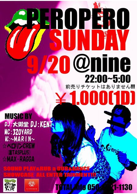PEROPERO SUNDAY 9月20日(日) 場所:9(グルメ通り真ん中あたりのB1F) door:1000yen(1D) good music by: ☆DJ:大御堂 ☆DJ:KENT ☆MC:320yard ☆MC:〜MARIN〜 ☆ペロリンcrew 裏TASPLUS ☆MAX-RAGGA REGGAEmusic&RABaDUB&DANCE SHOWCASE&ALL ENTER TAINMENT