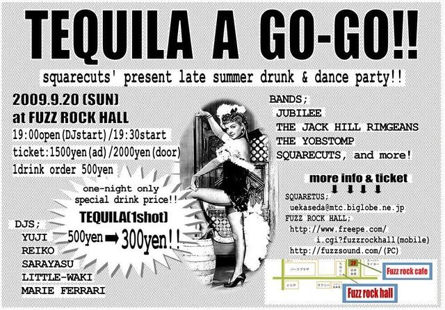 管理人様、告知失礼いたします。不適切なら削除願います。 TEQUILA A GO-GO!! 場所:霧島市 「FUZZ ROCK HALL」 日時:9月20日(日) Open 19:00 (DJ start) Start 19:30 (Band) チケット 1500円(前売り) 2000円(当日) ※ワンドリンク(500円)オーダー制 バンド ・THE YOBSTOMP ・THE JACK HILL RIMJEANS ・JUBLEE ・SQUARECUTS 地元バンド(未定) Dj ・YUJI ・SARAYASU ・LITTLE-WAKI ・REIKO ・MARIE FERRARI 特別企画 テキーラ通常500円が300円! ※ショットに限ります。 squarecuts