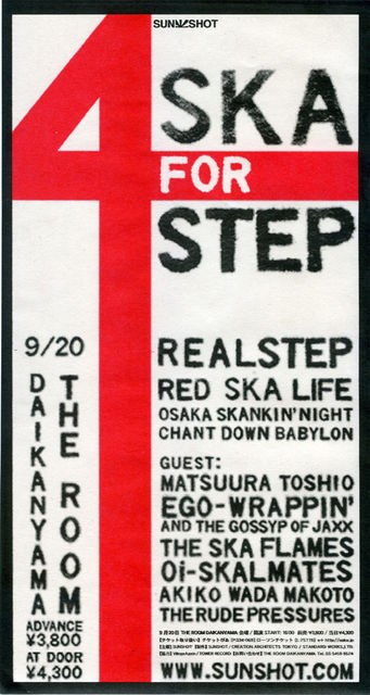 EVENING〜MIDNIGHT EVENTOpen 18:00 Close 5:00 CHARGE Adv \3000(1erk) Adm \3000 DJ HIROSHI/RYU/AK-1/TONE/PH@T/SHOWDAI LIVE EL,etsuco,MC306,CROWVER SP LIVE MILI&B-BAND J,DAZZEL 4 LIFE,TYRANT,TROOPER,HIGH-ENERGIE MIE AREA DANCER TACT CREW+BUCK WILD LOVE LIVE ANARCHIST+KAN-BBB NATURALIST TULA Chashew-Nats OFF STREET B GIRLZ GUEST DANCER PINO(ALMA)+SO-ICHIRO(GOLD RUSH)+NAO(So deep)+BOUNCE STREAM SN