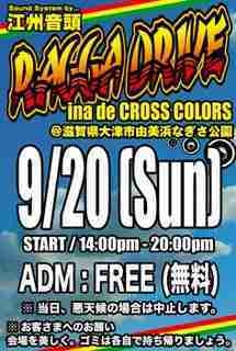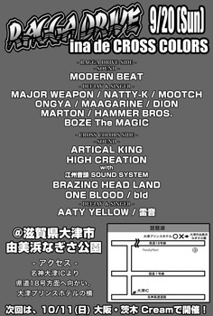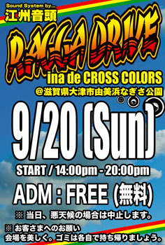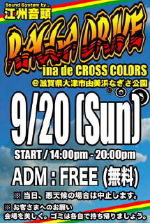 ちょっと 涼しくなってきましたが まだまだあります野外ダンス! 今回は江州音頭のシステムで 爆音レゲエをお届けします! RAGGA DRIVE ina de CROSS COLORS 9/20(日) Start.14:00pm-20:00pm @滋賀県大津市 由美浜なぎさ公園 =Sound System by= 江州音頭 -RAGGA DRIVE SIDE- =Sound= MODERN BEAT =Deejay & Singer= MAJOR WEAPON NATTY-K MOOTCH ONGYA aka POST MAN MAAGARINE DION MARTON HAMMER BROS. BOZE THE MAGIC -CROSS COLORS SIDE- =Sound= ARTICAL KING HIGH CREATION with 江州音頭 Sound System BRAZ