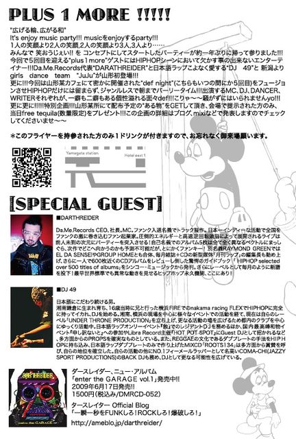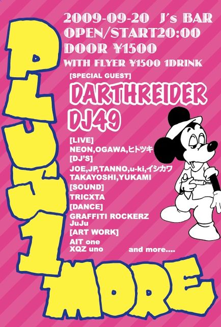 9月20日(日) 『plus 1 more 〜今夜はdefナイト〜』 @J's BAR(山形駅前ホテルイーストワンB1) OPEN/START 20:00〜 door\1500 with flier\1500(1drink付き) 【SPECIAL GUEST】 DARTHREIDER(Da.Me.Records) http://mixi.jp/view_community.pl?id=1720076 DJ 49(UNDER THRONE PRODUCTION) http://mixi.jp/view_community.pl?id=2667731 【LIVE】 NEON ogawa&ヒトツキ illanikat 【DJ's】 JOE JP TANNO イシカワ u−