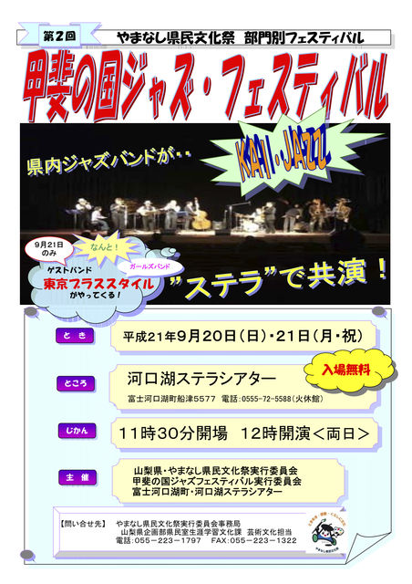 「甲斐の国 ジャズフェスティバル」が開催! ■日時:平成21年9月20日(日)・21(月・祝) 11:30 開場 12:00 開演 <両日> ■場所:河口湖ステラシアター(富士河口湖町船津5577) ■入場:無料 ■主催:山梨県・やまなし県民文化祭実行委員会 甲斐の国 ジャズフェスティバル実行委員会 富士河口湖町・河口湖ステラシアター ■出演者:県内において活動するグループ 9団体 ※9月21日(月・祝)のみゲストバンド「東京ブラススタイル」が出演 【 出 演 団 体 】