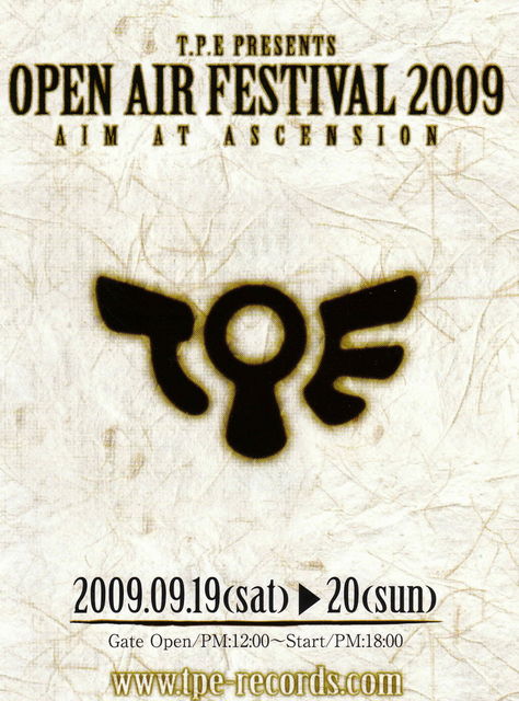 T.P.E PRESENTS -OPEN AIR FESTIVAL 2009- 【AIM AT ASCENSION 】 2009.9.19(sat)〜20(sun) Gate Open/PM:12:00 Start/PM:18:00 玉川キャンプ村(山梨県) LIVE SET: DIGICULT(DACRU RECORDS/BEL) CHRONOS(DACRU RECORDS/MEX) DJ SET: NEMESIS a.k.a DIGICULT(DACRU RECORDS/BEL) HESSEL a.k.a CHRONOS(DACRU RECORDS/MEX) TOKAGE(SIRIUS RECORDS/JP) YOSHIDANCE(T.P.E RECORDS/JP) SHOWMA(T.P.E RECORDS/JP) V&V(T.P.E RECORDS/JP) SARI(VISON QUEST/JP) 団長(跳乱州一家/JP) D.@.I(BUTTERFLY RECO