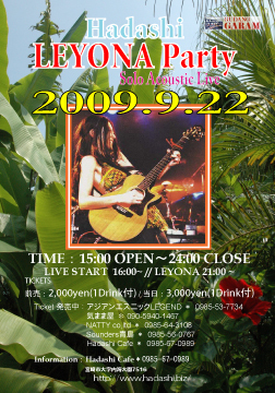 管理人様 宮崎市でのライブ情報の案内です。 不適切な場合はお手数ですが削除をお願いします。 【Leyona】 プローフィール 高校卒業と同時に上京し、LOVE69'sというバンドのヴォーカルを務める。 同バンドでシンガーとして高い評価を受け、ソロ・ヴォーカリストとなって1999年6月にシングル「オレンジ」でデビュー。 70〜80年代のロックとブラック・ミュージックを自身の音楽的背景とし、ソウルフルながらもひとつの枠にはまらないスケールの大きな歌唱を披露している。 http://www.leyona.net/ [Hadashi "LEYON