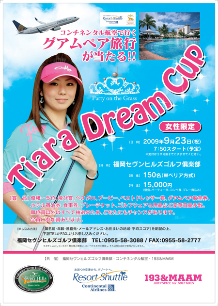 ついに夢の企画が決定!! 150名参加の女性だらけの大コンペ『Tiara Dream Cup』 な・な・なんとぉ〜 豪華賞品テンコ盛りのEVENTデスッ 液晶TV、有名ホテル宿泊券、有名レストラン食事券、ゴルフBAR『QUAD』無料券、、、、、 そして1番の目玉は〜 コンチネンタル航空で行く“GUAMペア旅行”が抽選で当たっちゃいます!!! お友達をたくさん誘って女性だらけのBIG コンペ Tiara Dream Cup ご参加くださ