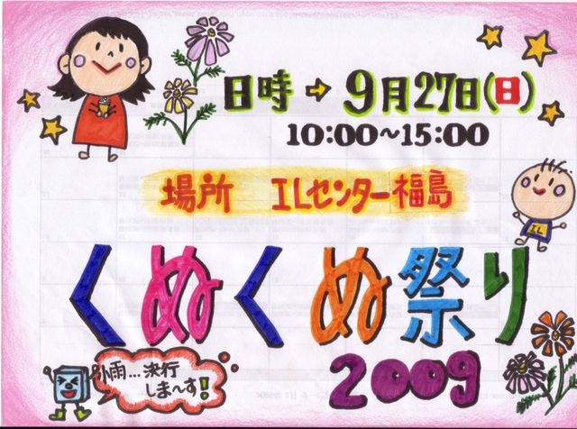 くぬくぬ祭り 今年も開催しま〜す 皆さん遊びに来てくださ〜い 日時:9月27日(日) 10:00〜15:00 場所:ILセンター福島 当日お手伝いして下さるボランティアさん募集しています。 宜しくお願いいたします。