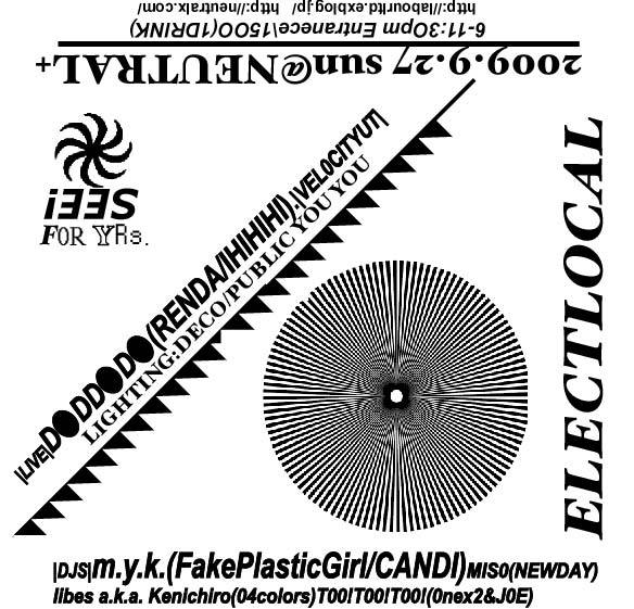 告知失礼します。 cafe/bar/gallery/free spaceを内包した諫早のNEUTRAL+にて。 ジャンルレス//インターセプティック!!エレクトローカルひさびさ開催致します。 今回は大阪と福岡から魅力的な2人の女性アーティストを迎え長崎勢もハイクオリティーなDJ布陣でお届けします。 ELECTLOCAL 2009.9.27sun @NEUTRAL+6:30-11:30pm Entrance \1500(1DRINK付) |DJs| m.y.k.(fake plastic girl/CANDI) MISO(NEWDAY) libes a.k.a. Kenichiro(04colors) TOO!TOO!TOO!(ONEx2&JOE) |Live| DODDODO (Adaadat/Renda/IHIHI) VELOCITYUT |L