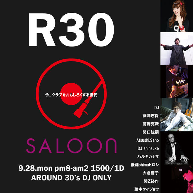 今、クラブをおもしろくする世代。 AROUND 30's DJ ONLY 『R30』@SALOON 9/28(MON) PM8-AM2 Y1500/1D 【DJ】 藤澤志保 菅野克哉 関口紘嗣 Atsushi,Sano(STAR DISH) DJ Shinsuke 後藤shimaヒロシ ハルキカナマ 吉永憲一 大倉智子 関Z裕作 藤本ケイジョウ