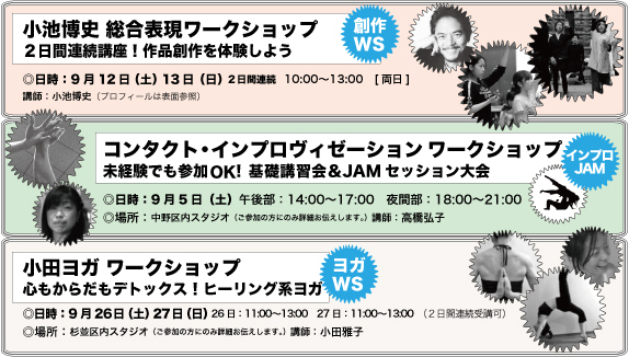 AI事務局の山内と申します。かきこみ失礼致します。パパ・タラフマラ舞台芸術研究所(P.A.I.)から、コンタクトインプロヴィゼーションワークショップ他,様々な身体表現に関するワークショップのお知らせです。何卒よろしくお願いいたします。 // ☆━━━━━━━━━━━━━━━━━━━━━━ コンタクト・インプロヴィゼーション ワークショップ [未経験でも参加OK!基礎講習会&JAMセッション大会] コンタクト・インプロヴィゼーションとは、人のからだと触れあいながら、お互いの力、重さ、意志などを交感させ、動きを生み出してゆ