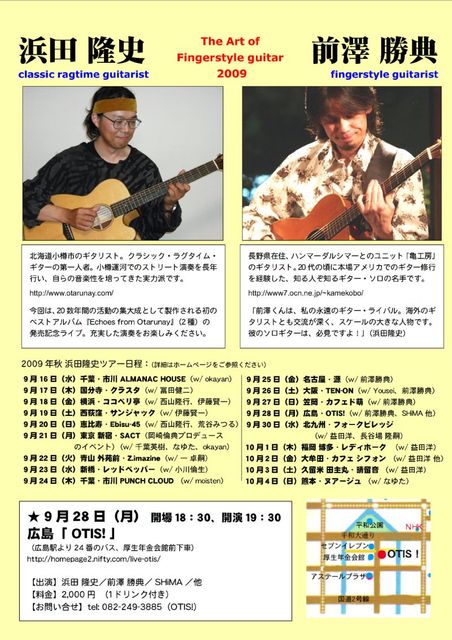 ★9月28日(月) 開場18:30、開演19:30 広島・OTIS! (広島駅より24番のバス、厚生年金会館前下車) http://homepage2.nifty.com/live-otis/ 出演:浜田 隆史(ギター、歌)/前澤 勝典(ギター)/SHiMA(ギター)/唐津人士(ギター) 料金:2,000円 (1ドリンク付き) お問い合せ:tel: 082-249-3885(OTIS!) やはり一年ぶりに、広島のOTIS!さんでライブをします。 一年に一度OTISに行くといつも、いやぁ、本州ツアーをしてるんだなあ〜、と実感するのです! 今回はいつもと少し違い、ソロギターの対