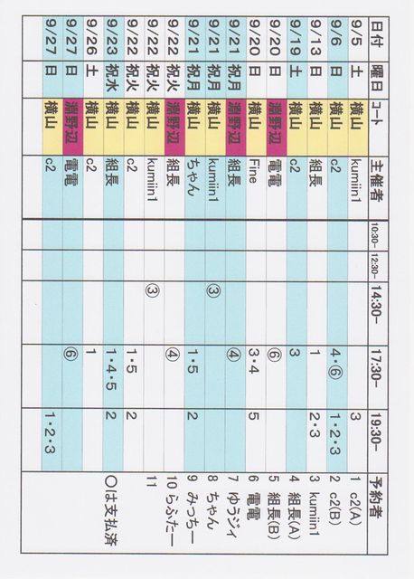 9月のイベントを整理しました。 テニスが好きな方であれば誰でも参加できます 初心者の方も気軽に参加してください。 基本的に先着順で受付けておりますので、早めの参加表明をお願いします!! コートを予約出来た方はコメント下さいね。 ----------後半のイベント情報---------- ***15日(火)*** 【終了】淵野辺公園 17:30〜19:30 1面(c2b) 主催者:c2さん http://mixi.jp/view_event.pl?id=46195394 ***17日(木)*** 【終了】大野台南 12:30〜14:30 1面(c2b) 主催者:c2さん http://mixi