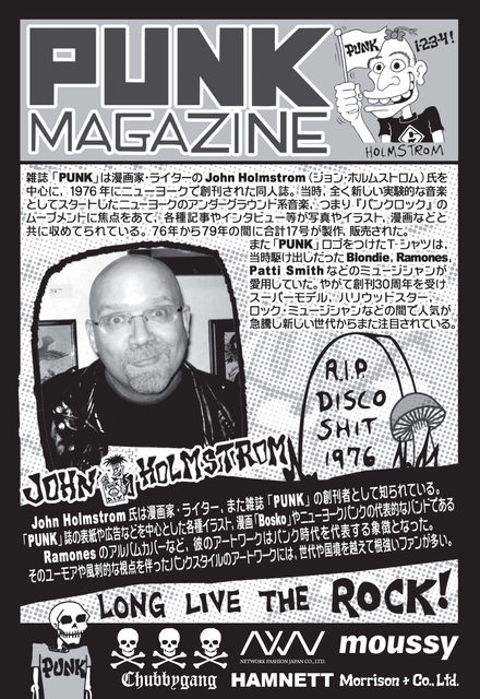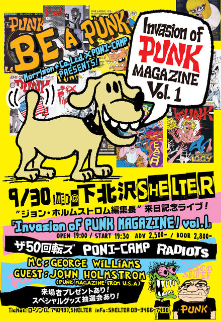 9/30(水)Invasion of PUNK MAGAZINE!vol.1 〜ジョン・ホルムストロム編集長来日LIVE〜 ザ50回転ズ/PONY-CAMP/RADIOTS MC:GEORGE WILLIAMS GUEST:JOHN HOLMSTROM(FROM U.S.A.) [場所] 下北沢SHELTER [住所] 東京都世田谷区北沢2-6-10仙田ビルB1 [時間] 19:00開場 19:30開演 【前売/当日】 ¥2500 / ¥2800(ドリンク代別) ローソンチケット0570-084-003(Lコード:79093) *8/29より発売しています。 【問】 下北沢SHELTER TEL:03-3466-7430 www.loft-prj.co.jp/SHELTER/ *来場者全員プレゼントあり