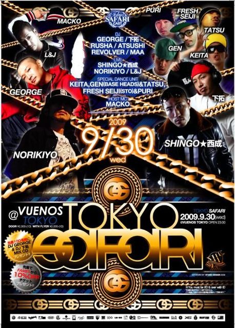 管理人様告知失礼致します!! 大阪で毎回えらいことになっている大阪を代表するパーティー『OSAKA SAFARI』、その東京バージョンでもある『TOKYO SAFARI』が9月30日にVUENOSで開催決定 前回4月に開催し、平日ながらも600人を超えるオーディエンスであふれ大盛況に終わったTOKYO SAFARI今回もえらいことになってます DJには前回同様、OSAKA SAFARIでメインを勤めるDJ GEORGE & DJ 下拓そしてメインホストには浪速の盛り上げ番長MACKO LIVEには『SHINGO☆西成』『NORIKIYO』『L&J』、DANCEにはKEITA&GEN(