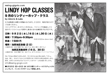 スイングジゴロ開催のリンディークラスの案内です。 2日の水曜日だけ、場所が変わりますのでご注意ください。 初心者の方〜ある程度踊れる方を対象に行っています。 ベイシックを中心に、音楽に合わせて楽しく踊れる内容になっています。 ご質問、問い合わせは info@swing-gigolo.com までご連絡ください。 ●日時:9月2日(水)、16日(水)、30日(水) ●時間:午後7時30分から9時30分(9時から9時半はフリーダンスタイム) ●場所:2日池尻地区会館/IKEJIRI CHIKU KAIKAN (田園都市線、池尻大橋駅下車,徒歩7分。) http://www.