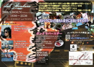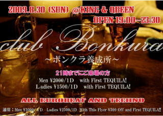 clubボンクラ 〜ボンクラ養成所〜 in キンクイ 8/30(日)19時〜23時半位 酒とユーロとテクノ♪ 酒乱と笑いの祭典ですw 注意1*当日はお酒を大量に飲みます。体調管理に気をつけて下さい(笑) 注意2*ボンクラできない方の入場をお断りしています(笑) フライヤー持参で21時までの入場に限り 男2000円 1D+ファーストテキーラ 女1500円 1D+ファーストテキーラ ※通常料金は男3000円女2500円となっており、フライヤー持参だと500円割引とさせて頂いております DJ 藤本、西、たぁちん、かずやん、たつよし(fr