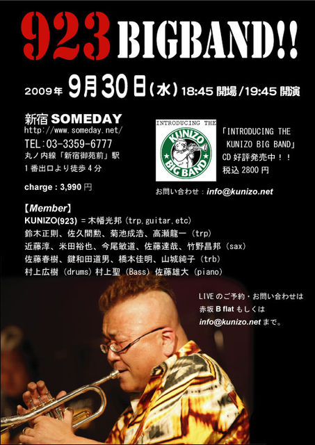 923BIGBAND@新宿SOMEDAY 今回のメンバーは! trp 鈴木正則、佐久間勲、菊池成浩、高瀬龍一 alto sax近藤淳、米田裕也、 tenor sax今尾敏道、佐藤達哉、baritone sax竹野昌邦 trb佐藤春樹、鍵和田道男、橋本佳明、btrb山城純子 pf佐藤雄大、bass村上聖、drs村上広樹 trp、gt、mc KUNI☆ZO 秋の923BB、乞うご期待です。