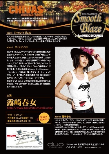公演タイトル■CHIVAS REGAL presents. Smooth Blaze Special 露崎春女 Super Soul Sessions 〜Vocalism〜 会場■渋谷duo MUSIC EXCHANGE http://www.duomusicexchange.com/ 公演日程■2009年9月30日(水) 開場時間■18:30 開演時間■19:30 主催■Smooth Blaze制作委員会 特別協賛■キリンビール株式会社 協力■SOGO TOKYO お問い合わせ■SOGO TOKYO http://www.sogopr.co.jp/ 03-3405-9999 出演■ 《ホストアーティスト》 露崎春女 http://www.harumitsuyuzaki.com/ 《サポートメンバー》 大坪稔明(Key) 知念輝