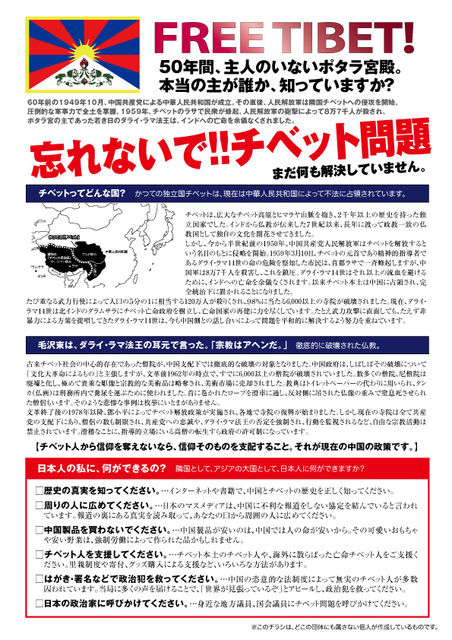 ☆抗議本トピはこちらです↓☆ 「【侵略された】聖地チベット – ポタラ宮と天空の【盗まれた】至宝 – 」展に抗議を! http://mixi.jp/view_event.pl?id=44591586&comm_id=7228 ------------------------ 上野の森美術館において開催される 「聖地チベット 〜ポタラ宮と天空の至宝〜」展に併せて、 有志を募って☆再び☆上野駅周辺でチラシ配りをします! 一緒にチラシ配りをしていただける方は、ぜひご参加ください。 ※前回と多少変更点がありますので、ご確認ください 【日程】 各日10:00〜17:30の予定 10月1