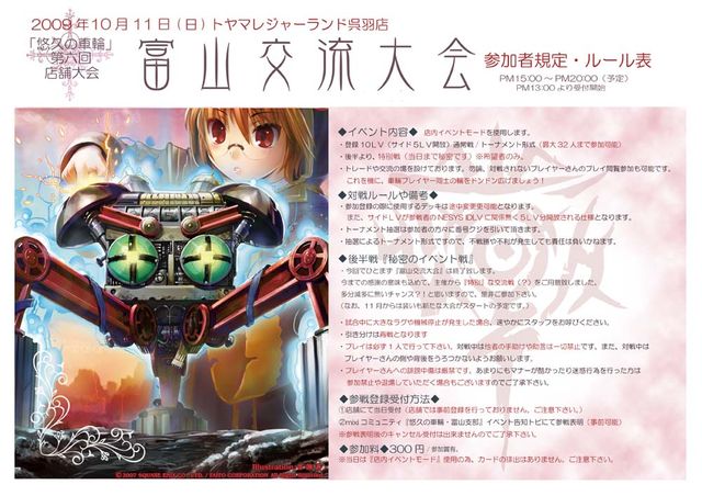 ◆開催店舗 トヤマレジャーランド呉羽店 ◆開催日時 2009年10月11日(日) 13時より受付開始〜14:45分まで 15時より大会開催〜20時終了予定 トレード等の交流の場も設けております。 ◆参加資格 16歳以上の全ての悠久の車輪プレイヤーさん。 (開催時間の都合上、16歳未満の方は参加出来ません) 参加方法 参加費300円。定員32名。 当日、店舗にて受付(14:45分まで) なお、店舗での事前受付はありません。 (mixi内、『富山 悠久の車輪コミュニティ』及びマキシャ内『悠久の車輪・北陸プレ