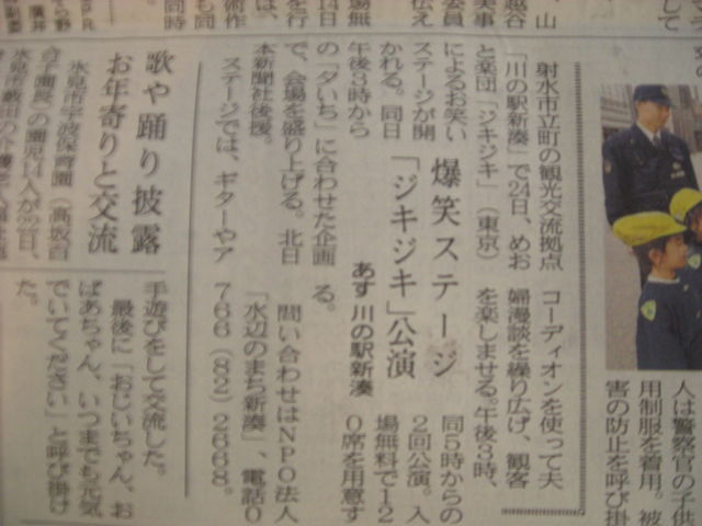 管理人様 宜しくです! あの・・・・抱腹絶倒の 本格的お笑い&本格的音楽&本格的夫婦ユニット「めおと楽団じぎじぎ」が ※ジギジギhttp://www.hotcola.com/zigizigi/ 富山県射水市 川の駅 新湊で・・・無料のステージを行います! ※川の駅新湊http://kankou.city.imizu.toyama.jp/www/view/detail.jsp?id=84 あの日本のロック史に今でも燦然と輝く伝説のロックバンド 「ダディ竹千代&東京おとぼけキャッツ」http://www.hotcola.com/otoboke/ のリードギタリストとして活躍した・・・・・・・・・・・・・ 「キーボー金