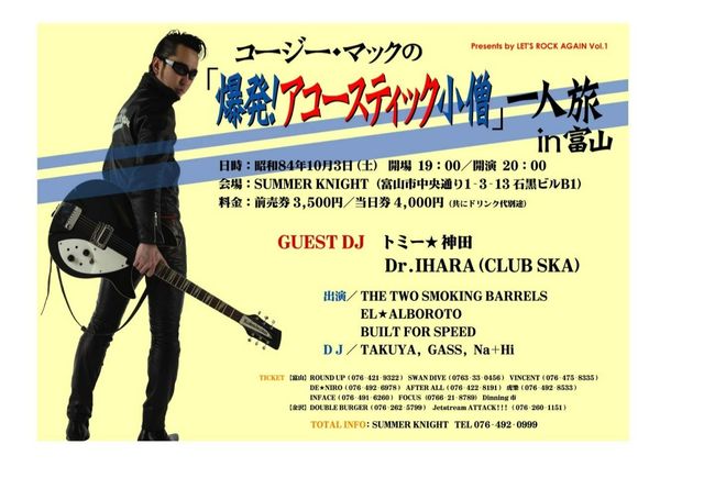 コージー・マックの「爆発!アコースティック小僧」一人旅 in富山 LET'S ROCK AGAIN Vol.1 ◆日時: 昭和84年10月 3日(土) 開場 19:00/ 開演 20:00 ◆会場: SUMMER KNIGHT (富山市中央通り1-3-13 石黒ビルB1) ◆料金: 前売 3500円/ 当日 4000円 (共にドリンク代別途) ◆GUEST DJ: トミー★神田/Dr.IHARA(CLUB SKA) ◆BAND: THE TWO SMOKING BARRELS/EL★ALBOROTO/BUILT FOR SPEED ◆DJ: TAKUYA/GASS/Na+Hi ◆TICKET 【富山】 ROUND UP 076-421-9322 DE★NIRO 076-492-6978 AFTER