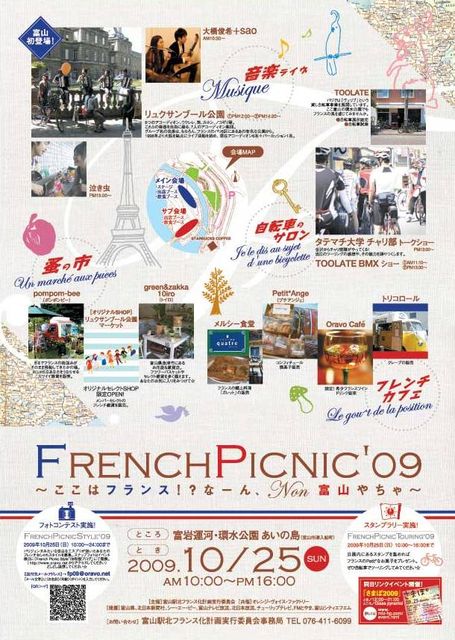 こんにちわ。 はじめまして、ミィと申します。 このコミュでは新参者ですが、どうぞよろしくお願いします。 10月25日に行われるイベントにみなさま愛用の自転車で 遊びにきていただきたく書き込みいたします!! □イベントタイトル: FRENCH PICNIC'09           ここはフランス!? な〜ん、NON富山やちゃ〜 □概要  会場:環水公園   料金:無料  時間:11時〜17時  出演:リュクサンブール公園、タテマチ大学 チャリ部  問い合わせ:駅北フランス化計画実行委員会       076-411-6099