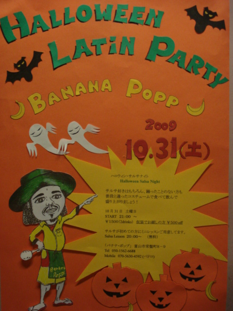 Banana Popp ペドロです。 ハロウィンラテンパーティーです。 みんなで仮装してラテンダンスしましょう。 「Halloween Salsa Night」 10月31日土曜日 START 21:00〜 ¥1500(2drinks)仮装でお越しの方¥500off サルサが初めての方にミニレッスンご用意してます。 Salsa Lesson 20:00〜 (無料) みんな本気の仮装できてね。 お待ちしてます!