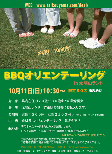毎年恒例のBBQオリエンテーリング まだ告知していないのですが 当コミュの方にフライング告知です。 日時 10月11日(日)10:30 集合 15時終了予定 参加費 男性4500円 女性2500円 今回も肉たくさん・賞品もアリ。 夏にやったファミリーパークの”トレジャーサファリ”の太閤山版です。 食材カード探しオリエンテーリング 集合時間10:30 対象 20代〜30代の独身男女80名 去年は大体90名ぐらいでした。 といっても誰もmixi内では信じてもらえませんが・・ほっとした顔 主催 ローターアクトクラブ新湊 協力 RITZエンターテ