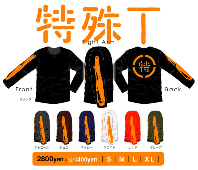 受注生産受付終了です 09/09/30 23:59〆切でした もう買えません、ごめんなさい、すみません。 オファーいただいた皆さん、ありがとうございました お振込方法等、こちらにまとめてありますので http://mixi.jp/view_bbs.pl?id=46719359&comment_count=0&comm_id=2105047 お時間あるときに、よろしくお願いしますね! ---以下、受注生産受付時の告知です。過去のモノです--- DVD/超ノリモノ1&2/発売(勝手に)記念 特殊T【トッT】 肌寒くなってきたこの季節、長袖緊急リリース。 貴方に必要なのは右腕に刻まれたこの特殊アーム!