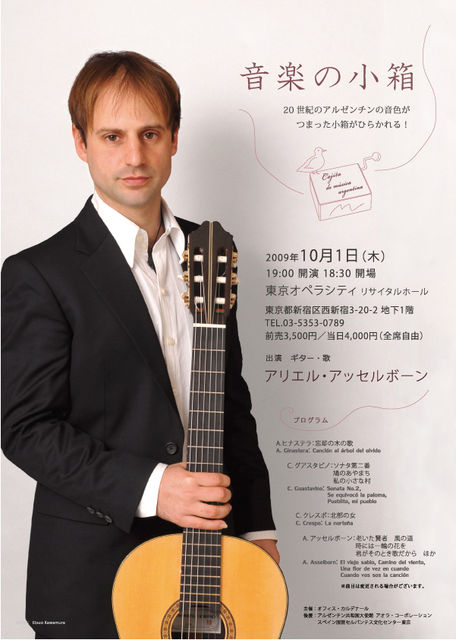 毎年秋のコンサートはオペラシティですが、今年は会場をリサイタルホールに移しパワーアップ! 開催まであと1か月となりました。チケットをまだご購入されていない方はお早目に。 場所: 東京オペラシティ リサイタルホール(初台) 〒163-1403 東京都新宿区西新宿3-20-2 地下1階 TEL. 03-5353-0789 料金: 全席自由3,500円(当日4,000円) 内容: ヒナステラ、グアスタビノ、クレスポなどアルゼンチンのギター音楽の潮流を作り上げた偉大な作曲家たちの作品を旅する美しい一夜の音楽会。 ●プログラム: A.ヒナステラ:忘却の木の