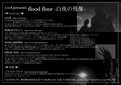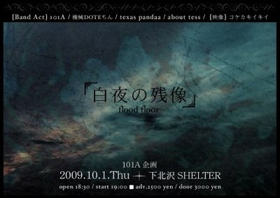 「flood floor -白夜の残像-」 2009年10月1日(木) Band Act: 101A, 機械DOTEちん, texas pandaa, about tess 映像: コケカキイキイ Adv:¥2,500 ※D代別 / Door:¥3,000 ※D代別 Open:18:30 / Start:19:00 下北沢SHELTER: 03-3466-7430 http://www.loft-prj.co.jp/SHELTER/ ■101A オフィシャル予約フォーム http://101a.org/form/ticket.html ■ローソンチケット(Lコード 76381) http://l-tike.com/index.html ■e+(イープラス) http://eplus.jp/sys/main.jsp