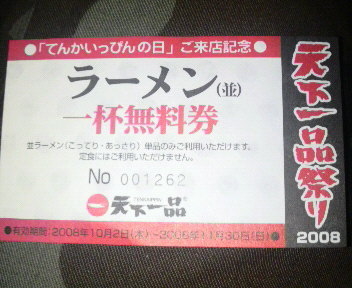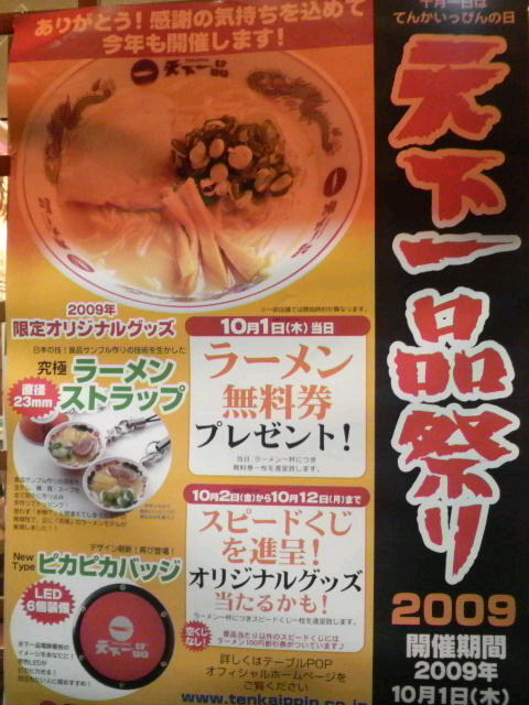 10月1日… 10、1… テン、イチ… 天、一… 天下、一品… はいっ 天下一品の日(笑) 今年もやって来ました 【天下一品祭り2009】 10/1は、来店者全員にラーメン無料券プレゼント 10/2〜10/12は、スピードくじでオリジナルグッズが当たるかも …と言うわけで、 10/1の当日に総本店へ「こってりラーメンを食って無料券を貰いに行こうぜツアー」を企画します MBKは、仕事後の時間から行きますので22時以降になると思います 時間の合う方は一緒に行