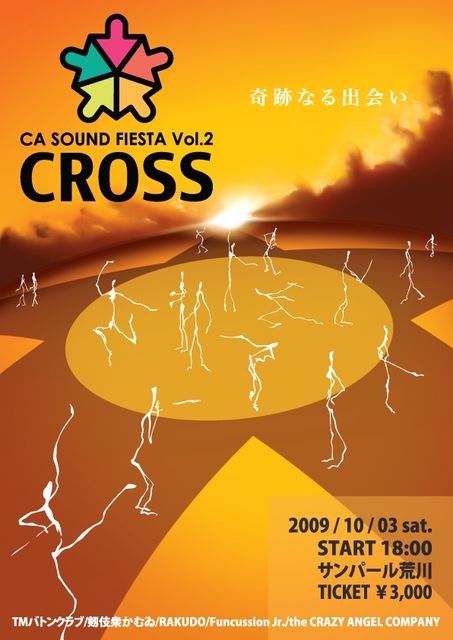 いよいよCA次回公演(2009年10月)詳細が確定しました! http://www.crazy-angel.com/2009/08/091003cross.htm 音楽を軸とした様々な分野のエキスパートが、ジャンルの垣根を越えて交差する。 ダンス、殺陣、バトントワリング、パーカッション、ブラスパフォーマンス、奇跡の出会いが実現したステージエンターテイメント"CROSS"。 かつてない世界、新たな文化を発信する! ■イベント名 CA SOUND FIESTA vol.2 "CROSS" ■日時 2009年10月3日(土) 18:00開演 ※受付開始は開演1時間前、開場は開演30分前 ■会場