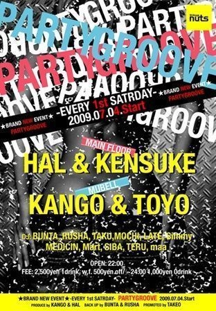 告知失礼致します!!! Shibuya NUTSの毎月第一土曜日に行われていたイベント"NEXT"が終えて新たなメンツで引き継いだ新たなNEW PARTY、『Party Groove』が先月から始まり大盛況に終わりました 名前の通りパーティー好きなお客さんでフロアは満たされ豪華なメンツに魅了されていきました!!その『Party Groove』、今回も東京問わず全国にて大活躍中のDJ KANGO/HAL/TOYO/KENSUKEといった豪華なメンツで毎月第一土曜のNUTSを盛り上げる事間違いないです 若手DJ陣も都内各所、東京問わず様々な場所で活躍しているメンツ