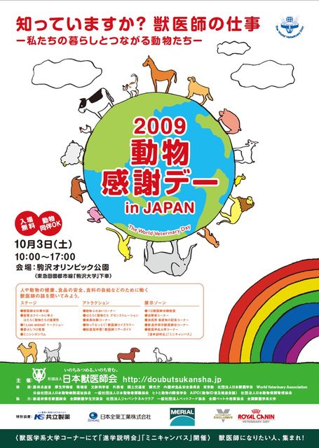 昨年、17,000人のご来場をいただいた「動物感謝デー in JAPAN」。 ペットとオーナーの絆をさらに深くするために 3回目の今年は、さらに充実した企画で皆様をお待ちしています。 イベント名 : 2009動物感謝デー in JAPAN “World Veterinary Day” 日時 : 2009年10月3日(土) [10:00 〜 17:00] 会場 : 駒沢オリンピック公園 中央広場 主催 : 社団法人 日本獣医師会 動物好きな有名人と人気ペットブロガーの獣医師を交えてのトークショー。 獣医師とドックトレーナーが愛犬のしつけを伝授!! ドラマ、映画でお馴染みの盲