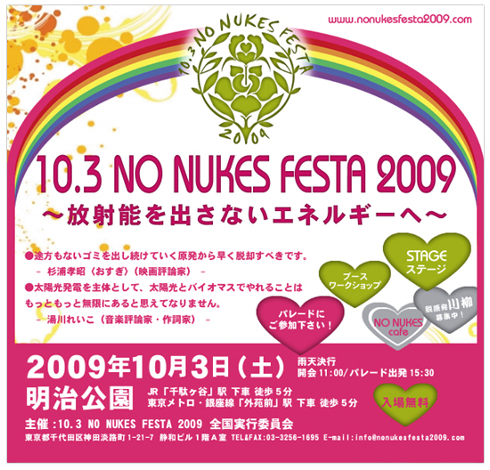 「10.3 NO NUKES FESTA 2009 〜放射能を出さないエネルギーへ〜」 10月3日は明治公園へ! エネルギー政策の転換に向け集まりましょう! http://www.nonukesfesta2009.com/ 地球温暖化の防止、クリーンエネルギー、このような宣伝で原発は推進されていますが、本当にそうなのでしょうか? 電力需要に合わせた調整がきかない原発は、けっきょく火力発電に頼り、CO2を減らすことにつながらないのです。それどころか、原発や再処理工場からは日常的に放射能が放出され、放射能災害の危険が拭い去れません。何世代も先までごみ(核廃棄物)を残