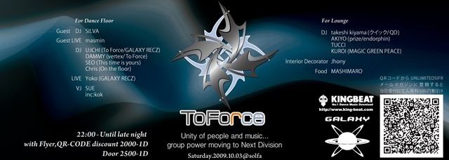 管理人様告知失礼致します。 中目黒Solfaの偶数月第一土曜レギュラーイベント、To Force. 毎回四つ打ちの今旬なアーティストが出演して、 絶賛好評開催中のイベントです♪ 次回To Forceはハロウィンスペシャル、 今回もシルバ、マスミンを迎え、豪華ゲスト目白押しで開催します!!! お見逃しなく、ぜひぜひ遊びに来て下さい♪ ディスカウント要望の直メッセなど、お気軽にご連絡下さい。 以下詳細です。 中目黒のラグジュラリーなダンスホール、 club solfaにてアッパーハウスからプログレ・テックまで揃えた四