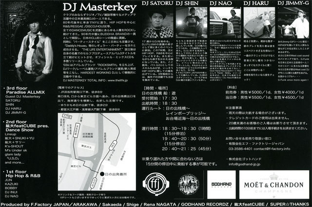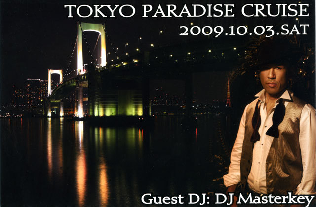 <TOKYO PARADAICE CRUISE> 東京湾の夜景を眺めながらの船上パーティーで船上音楽イベント。 流れ煌めく東京湾岸の夜景をバックに、美味しいお酒をたしなみ、お酒、ダンス、出会いで、上質な音楽に身を委ねる。 東京湾からレインボーブリッジやお台場を一望できるロケーション。 心地良い潮風を感じながら、あなたの大切なお仲間達と最高のひとときを楽しみませんか? ■開催日:2009/9/26(sat) <DJ Lin Up> ◎屋上デッキ:Paradaice ALL MIX ・GUEST DJ:Masterkey ・SATORU ◎2Fフロア:鉱大featCUBE pres. Dan