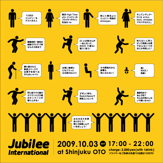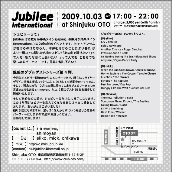 こんにちは。夕方ロックパーティー Jubileeのお知らせです。音で5年間夕方の時間を盛り上げてきたJubileeもラスト3回です! Jubilee -International- vol.54『疑惑のダブルゲストシリーズ その4』 2009.10.03 (sat) 17:00-22:00 at Shinjuku OTO DJ : eliko , oh!kawa , よしーだ Guest DJ : rie(High Time) , shimoyan charge : 2000yen with 1drink (フライヤー持参の先着10名様は1500yen with 1drink) ダブルゲストシリーズ第4弾。 今回はジュビリー開始時からのメンバーであり、現在はフライヤーデザイン担当&横浜