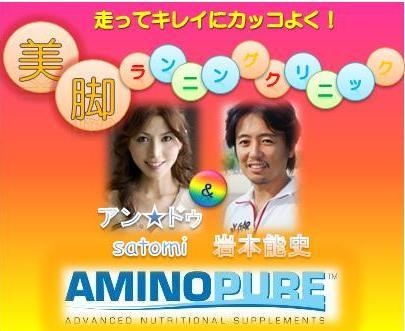 人気モデルにしてマラソンランナーのアン☆ドゥsatomiと、ウルトラマラソンランナーの岩本能史が、『脚が太くならない走り方』を、理論とヨガを用いたランニングクリニックで行います♪ ランニング&ヨガで『絶世の美脚』を目指しませんか? 気になる美脚ランニングクリニックの内容は・・・ ★理想のランニングフォームの解説 ★アリュールヨガインストラクター資格取得のsatomiによるヨガレッスン ★ランニング体験レッスン ※もれなくアミノ酸サプリ「アミノピュア」をプレゼント! ■ ■ ■ ■ ■ ■